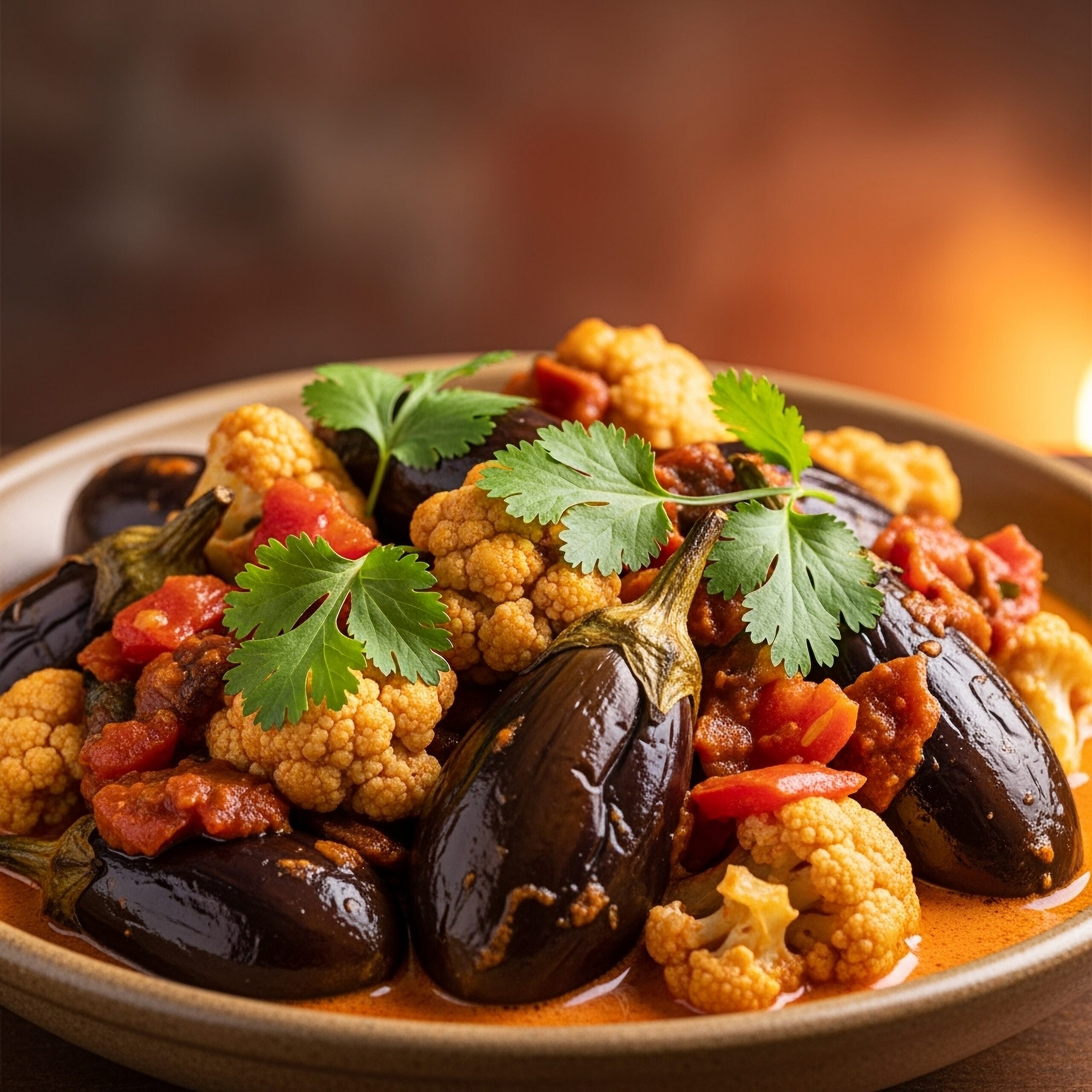 Madras style baby aubergine and cauliflower curry, roasted aubergine and cauliflower simmered in tempered coconut milk with tomato and tamarind
