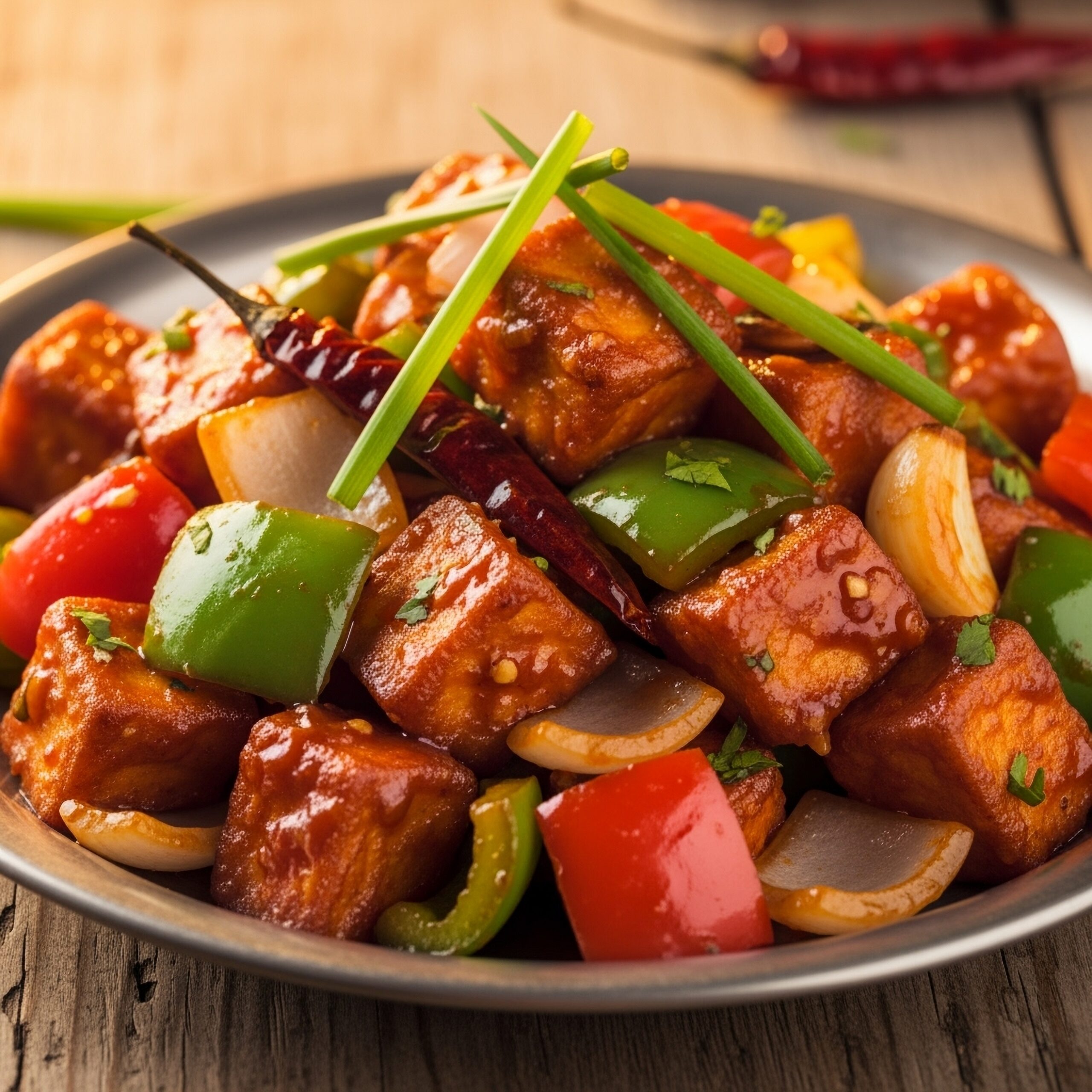 Indo Chinese streetfood favourite, paneer cooked with bell peppers, onion in a sweet and spicy garlic and chilli sauce