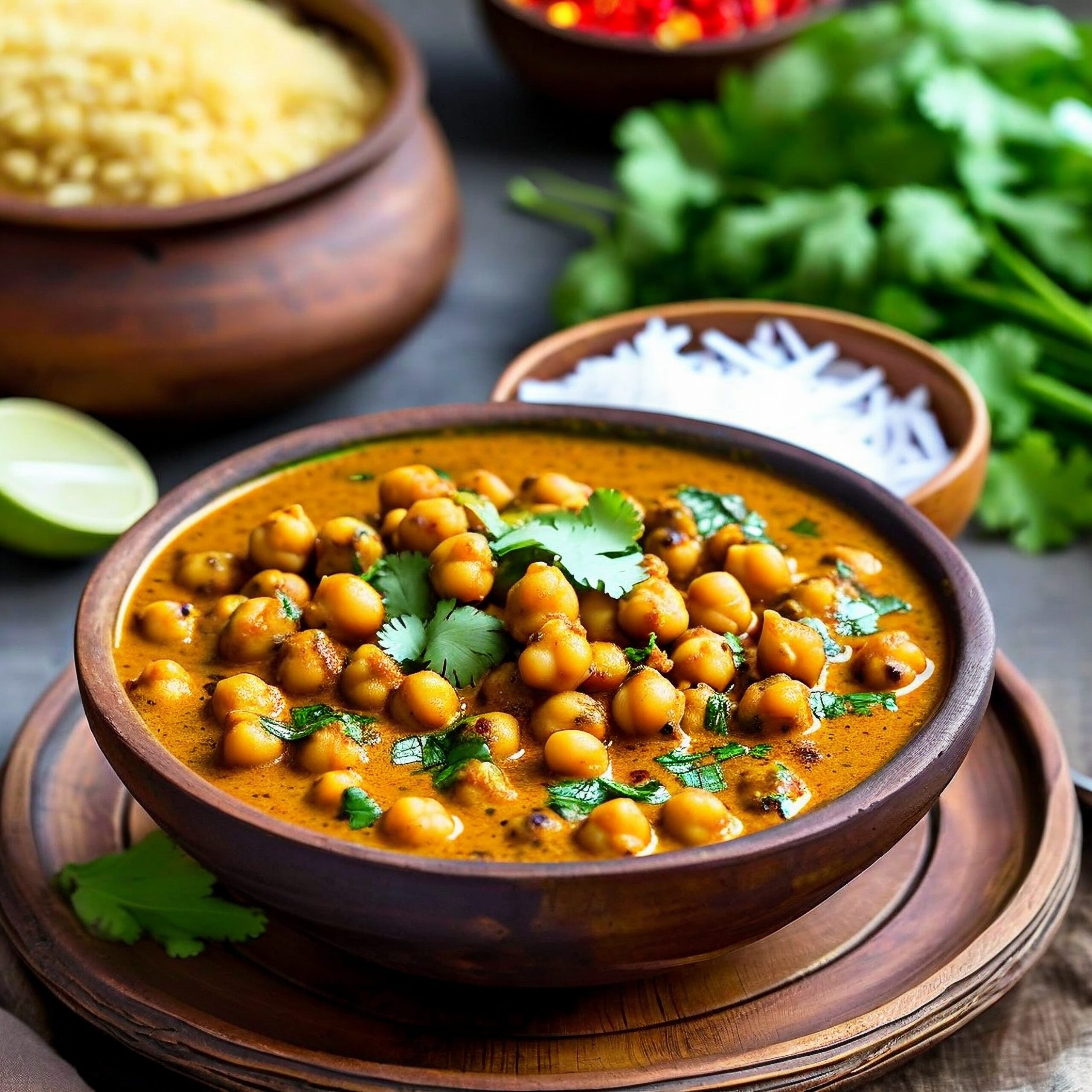 Chickpea simmered in a south Indian Keralan coconut milk curry spiced with aamchoor, chilli and ground coriander
